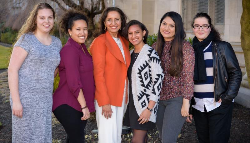 Pictured (left to right): Fabiana Rebollo, English and Special Education, ETA, Uruguay; Nicole Colon, Graduated in May 2016, English, ETA, Malaysia; Professor Irma Maini, Fulbright Program Advisor; Ana Acosta, English, ETA, Peru; Iqra Choudry, English and Secondary Education, ETA, Indonesia; Rubi Cedeno, Women and Gender Studies, ETA, South Africa