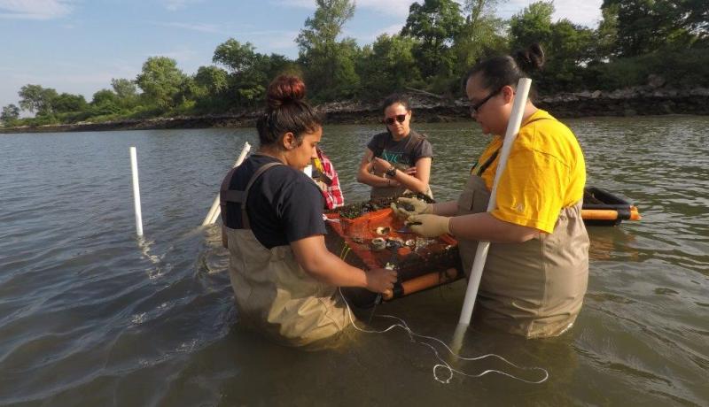 Last summer, NJCU biology students Raysa Dominguez, Margaret Ramirez, and Marily Ruiz (pictured left to right) worked with their professor, analyzing samples from the oyster reef. They measured samples for size and listed all invertebrate organisms found. The students were supported on their summer research projects through grants to the Biology Department from the U.S. Education Department Minority Science & Engineering Improvement Program (MSEIP) and the Hispanic Serving Institution (HSI) STEM grants to the Biology Department.