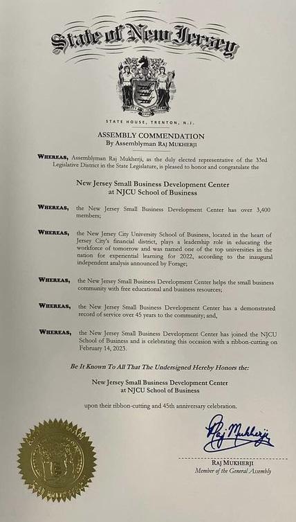 During the ceremony, New Jersey State Assemblyman Raj Mukherji (D) of District 33 in Jersey City — the Deputy Speaker and Deputy Parliamentarian of the legislature — presented an Assembly Commendation on behalf of the state, honoring the NJSBDC at the NJCU School of Business.