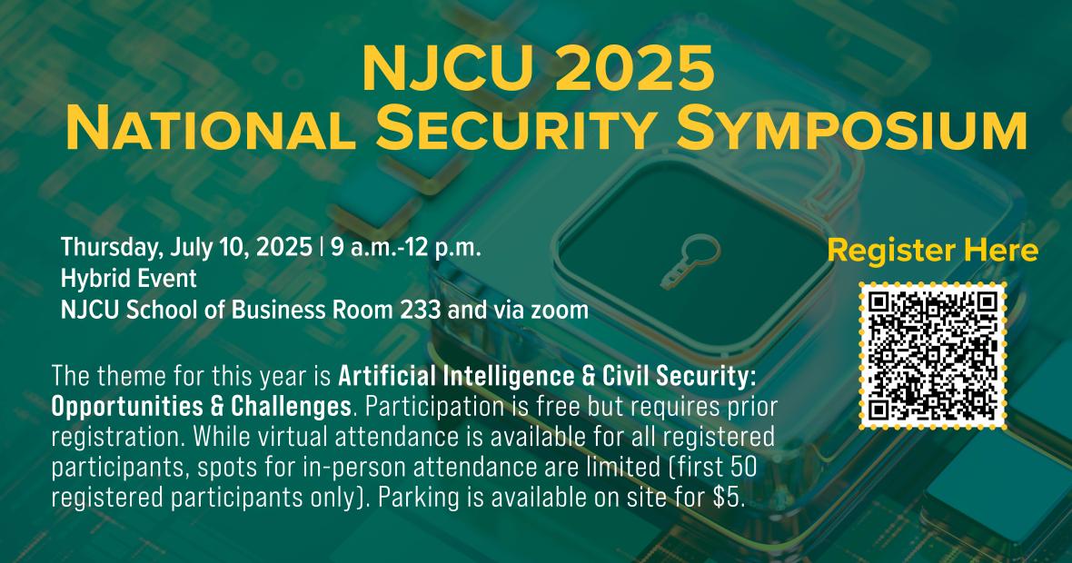 | Thursday, July 10th | NJCU 2025 Annual National Security Symposium | 9AM - 12PM | The theme for this year is Artificial Intelligence & Civil Security: Opportunities & Challenges. Participation is free but requires prior registration. While virtual attendance is available for all registered participants, spots for in-person attendance are limited (first 50 registered participants only). Parking is available on site for $5. |