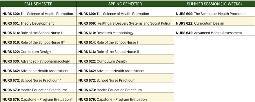 The School Nurse and Health Education Practicum courses (NURS 672 & NURS 673) allow for full-time nurses to complete their Practicum hours at the schools where they are currently employed.