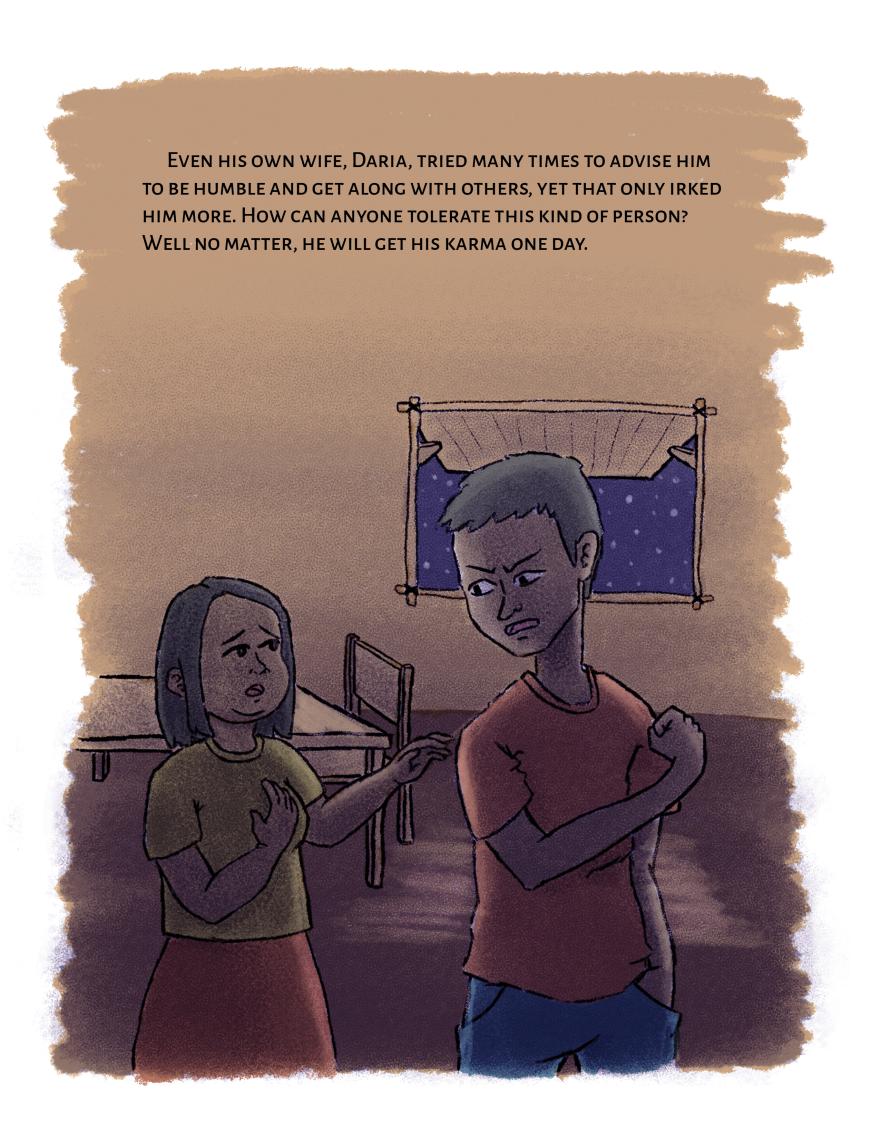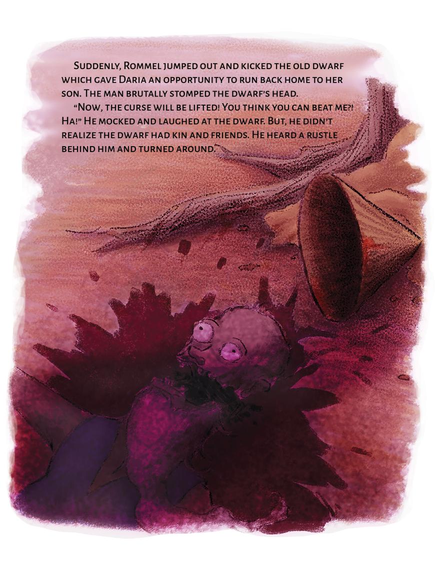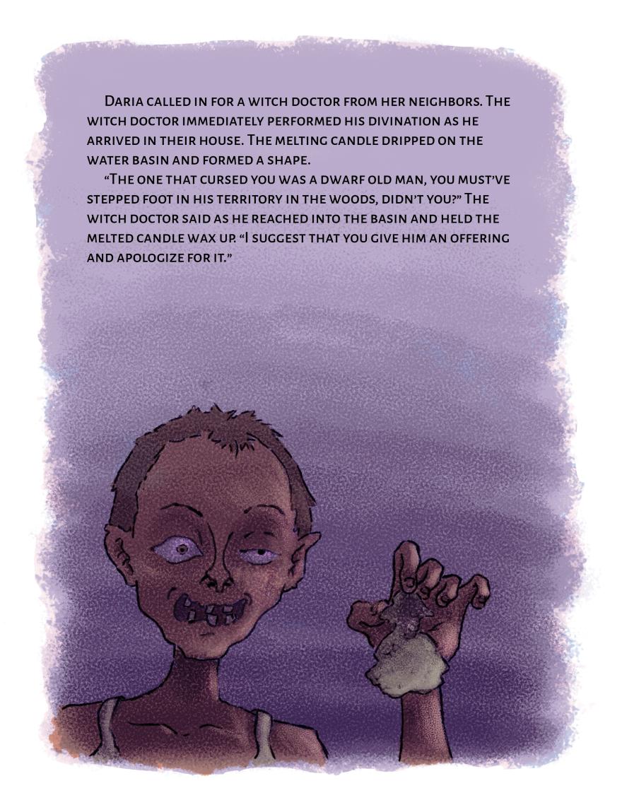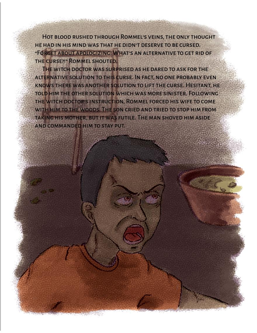 I am interested in learning more about the Philippine folktales and I wanted to write stories based on them to share them with others. There are many Filipino folktales that may have been forgotten, but with this, I would like to remind people of these folktales again and have new people know about them. The book is based on a Filipino folktale called Nuno sa Punso or Dwarf on the Mound. The folktale is about an old dwarf who lives on a mound in the forest, and they are known to be very territorial. Whoever destroys their home or disrespects their house would be cursed. The cursed would experience unnatural symptoms, such as swollen parts of their body or peeing black liquid. Along with that, that person would start to go insane the longer they have the curse. This book is done digitally, and the art style for this book is rough and dark to depict a sinister theme.