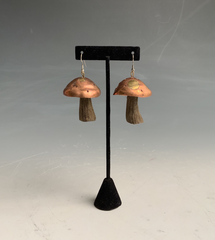 Mushroom Earrings, Medium: Copper, Brass, Wood, Dimensions: 3inx1in, 2019