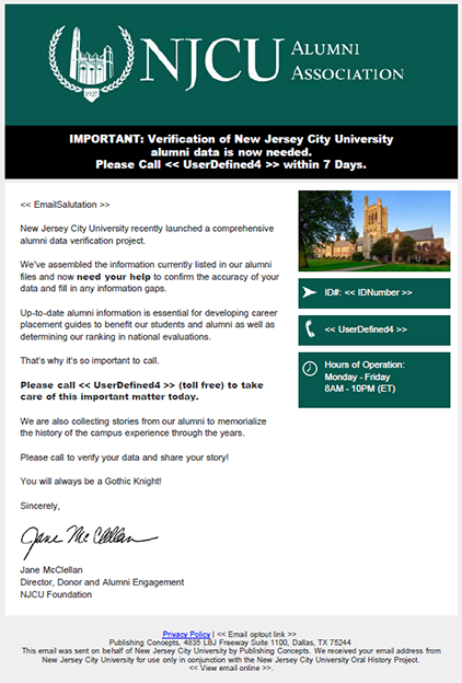 You will be sent an email as well. Once you receive the email, please follow the instructions to update your information and set up an interview time to share your NJCU memory. If you do not receive it, please take this opportunity to call PCI at 1-866-571-1803 and update your contact information so we can stay connected.