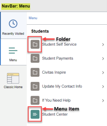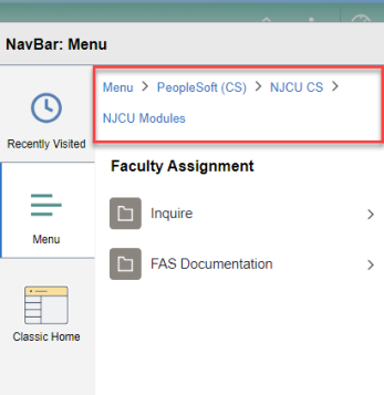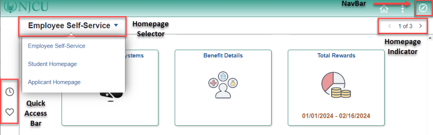 - NavBar - Quick access to PeopleSoft resources via the NavBar, which can be located by the compass icon in the top right corner of the dashboard.