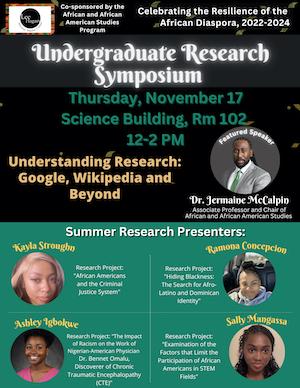 Event description: The Undergraduate Research Symposium was organized to showcase the research of Hagan Center’s Summer Research Scholars. Four NJCU students, Kayla Stroughn, Sally Mangasa, Ashley Igbokwe, and Ramona Concepcion, gave presentations about the research they conducted during the summer through the Hagan Summer Research Scholar Program (HSRSP). Under Hagan’s “Celebrating the Resilience of the African Diaspora, 2022-2024” program, these students presented diverse topics which connected to this program. Research themes included African Americans and the criminal justice system, limitations for African Americans in STEM fields, racism towards prominent Black figures, and Black identity. The students answered questions from the audience regarding their research process, working with their mentors, and the overall experience - firmly inspiring their peers and sparking their interest about research and such opportunities. Finally, Dr. Jermaine McCalpin was the keynote speaker for the Symposium, and he began this event with a presentation about understanding research and its importance.