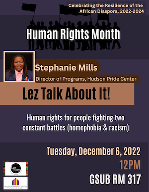 Stephanie Mills gave a very educational and interactive presentation at New Jersey City University. In honor of Universal Human Rights Month, Ms. Mills spoke about the importance of human rights to the LGBTQI+ community. She talked about the ways her identity shaped her journey as an activist and leader, and shared examples of her experiences with homophobia and racism. She encouraged the guests to share their own stories and led a very interesting Q&A session. Ms. Mills’s event ultimately created a safe and comforting environment, especially for NJCU’s queer student body, particularly in light of recent events in Colorado Springs which cruelly targeted the LGBTQI+ community.