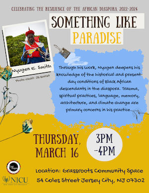 Nyugen E. Smith is a first-generation Caribbean-American interdisciplinary artist based in Jersey City, NJ. Through performance, found object sculpture, mixed media drawing, painting, video, photo, and writing, Nyugen deepens his knowledge of the historical and present-day conditions of Black African descendants in the diaspora. Trauma, spiritual practices, language, memory, architecture, and climate change are primary concerns in his practice.