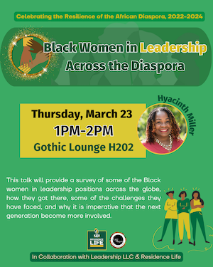 Professor Miller’s presentation will provide a survey of some of the Black women in leadership positions across the globe, how they got there, some of the challenges they [have] face[d], and why it is imperative that the next generation become more involved. Her research focuses specifically on Black women in politics around the world.
